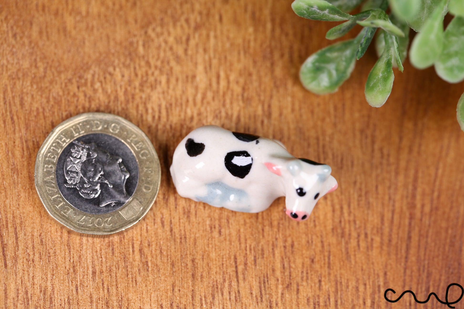 Hand Painted Tiny Ceramic Cow Figurine – Miniature Animal Gift, Collectable Pottery Ornament, Cute Shelf Decor