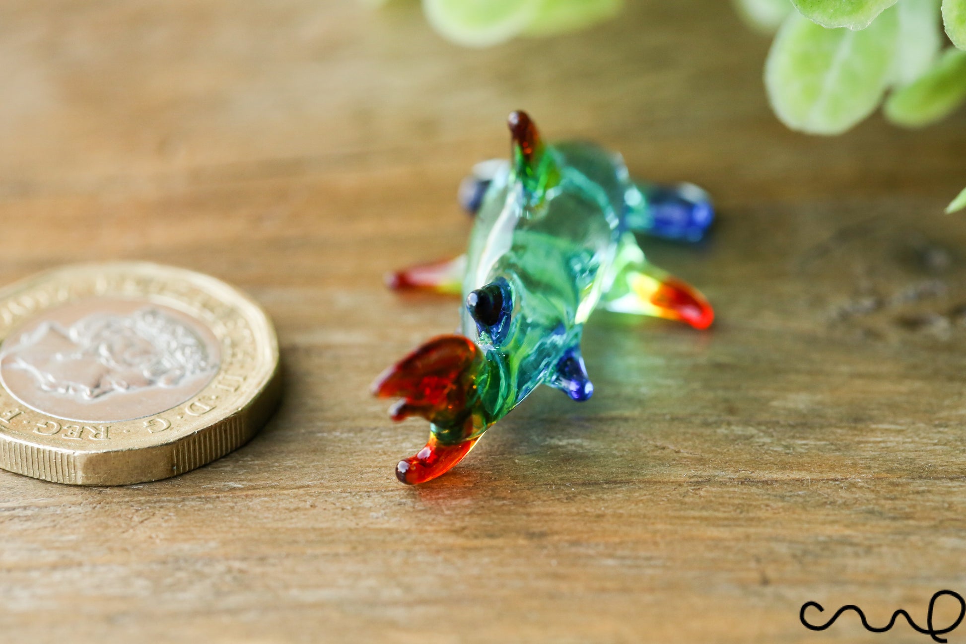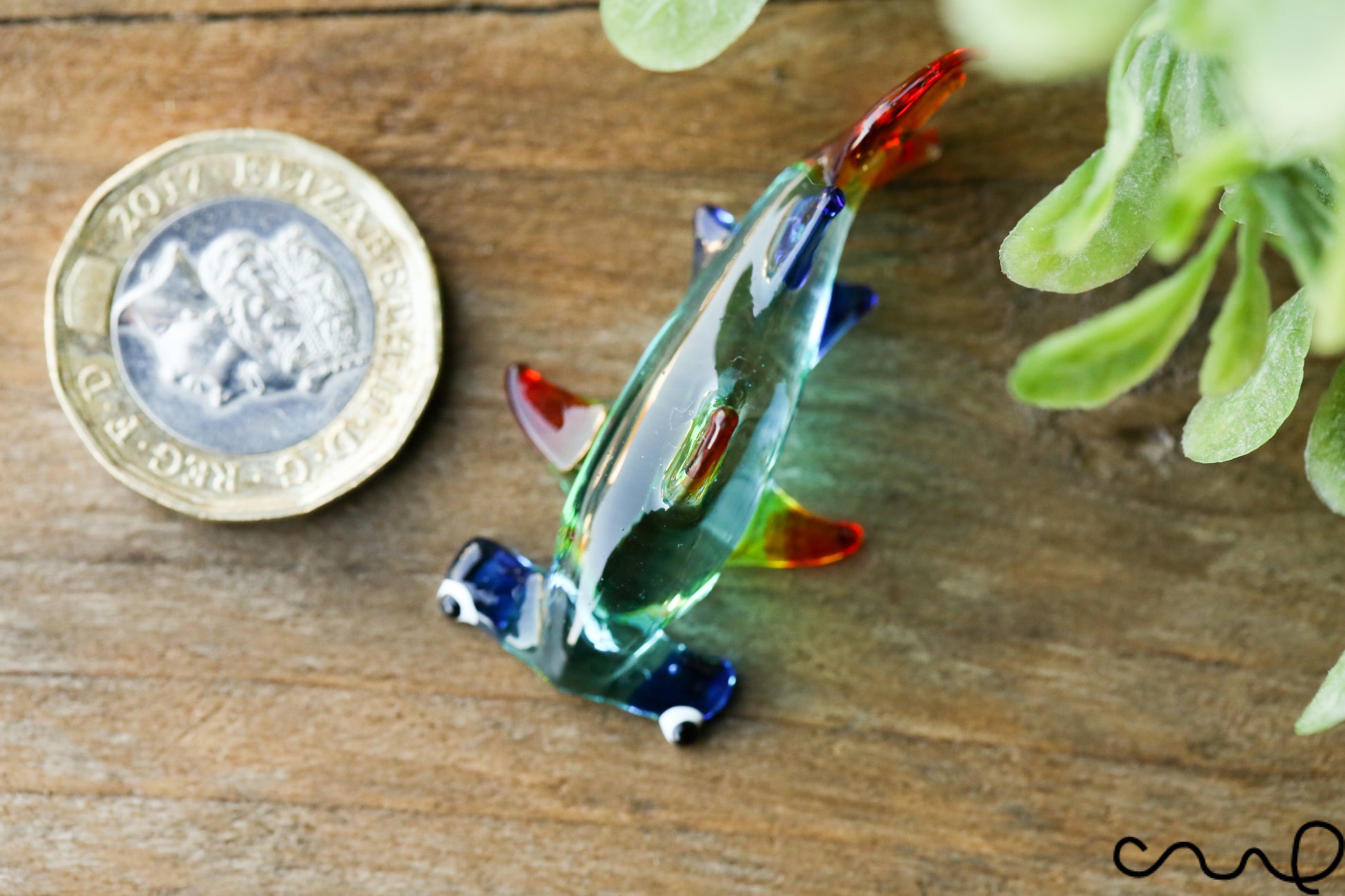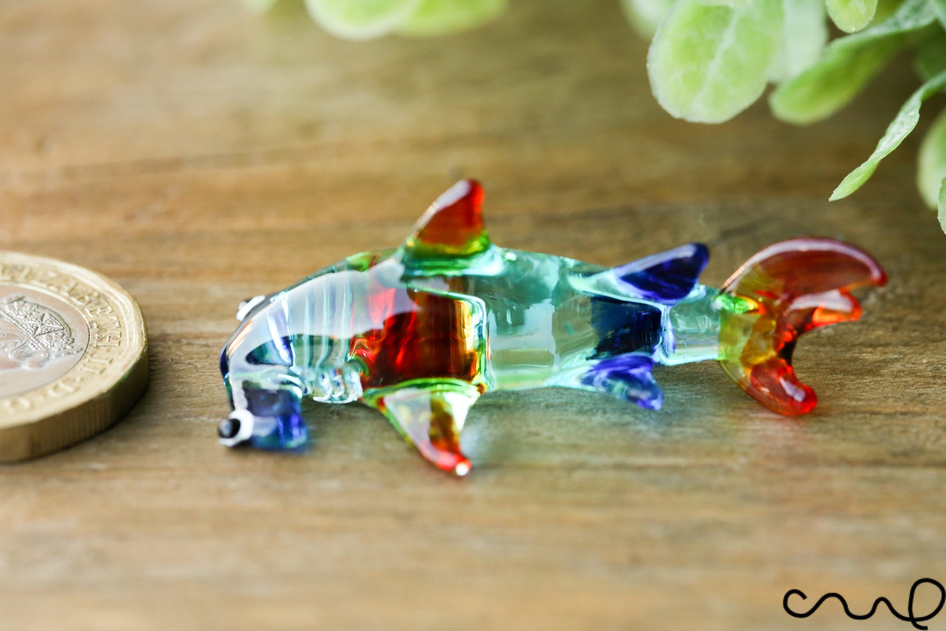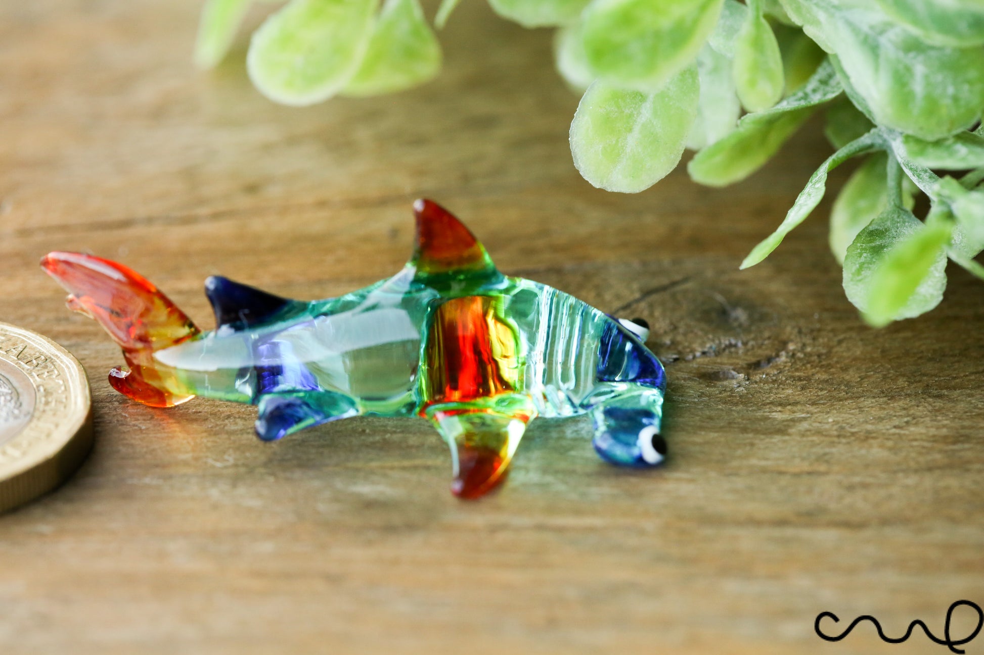 Add a splash of ocean charm to your collection with this Little Glass Hammerhead Shark. Carefully handmade and hand-painted, this miniature shark features sleek stained glass details and a distinctive hammerhead design—perfect for marine life lovers and collectors alike.