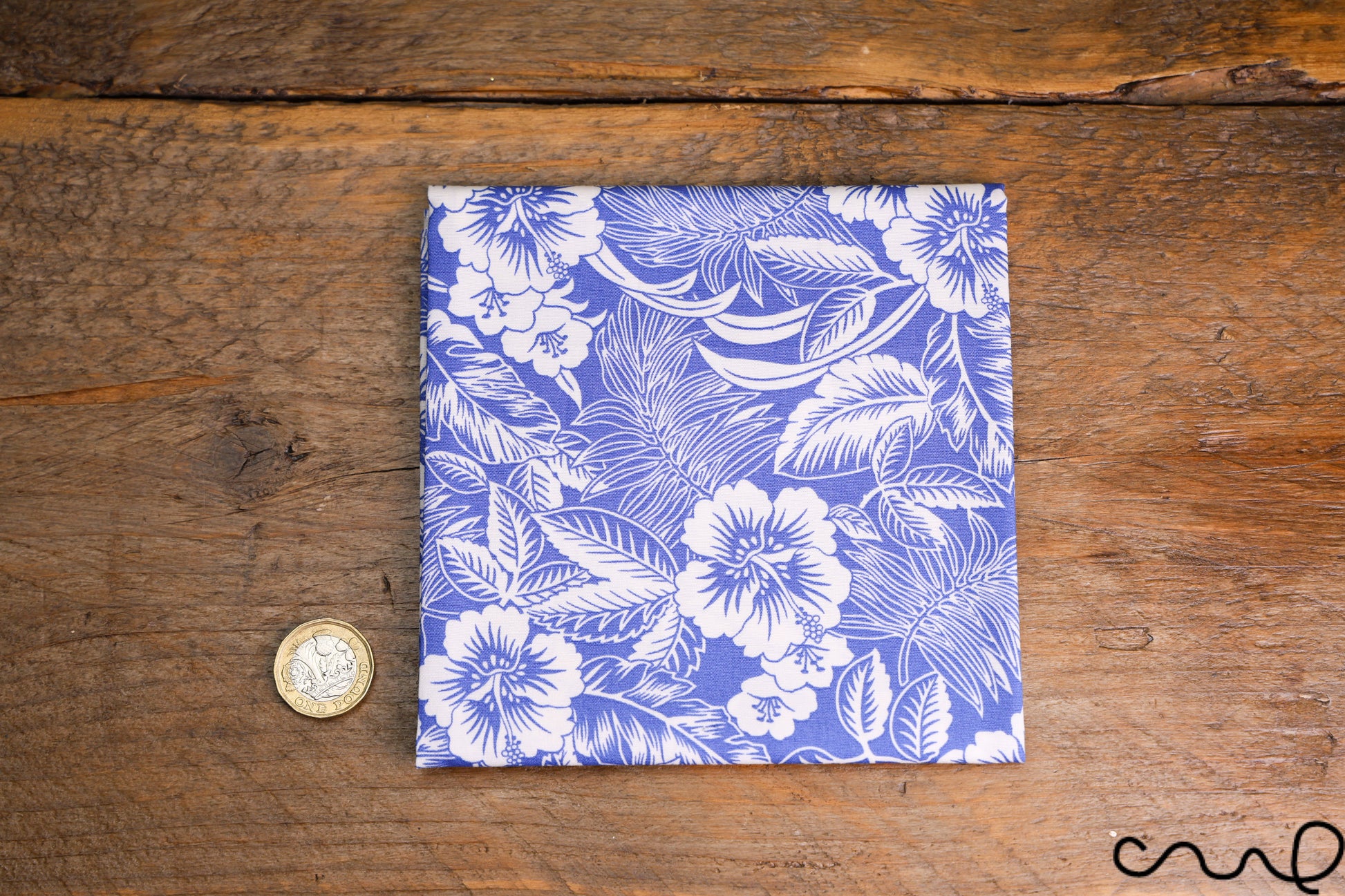 Add a breezy, tropical touch to your look with this handmade cotton floral bandana. Crafted from 100% high-quality cotton, it features a bold blue and white tropical pattern – perfect for brightening up your outfit for any occasion.