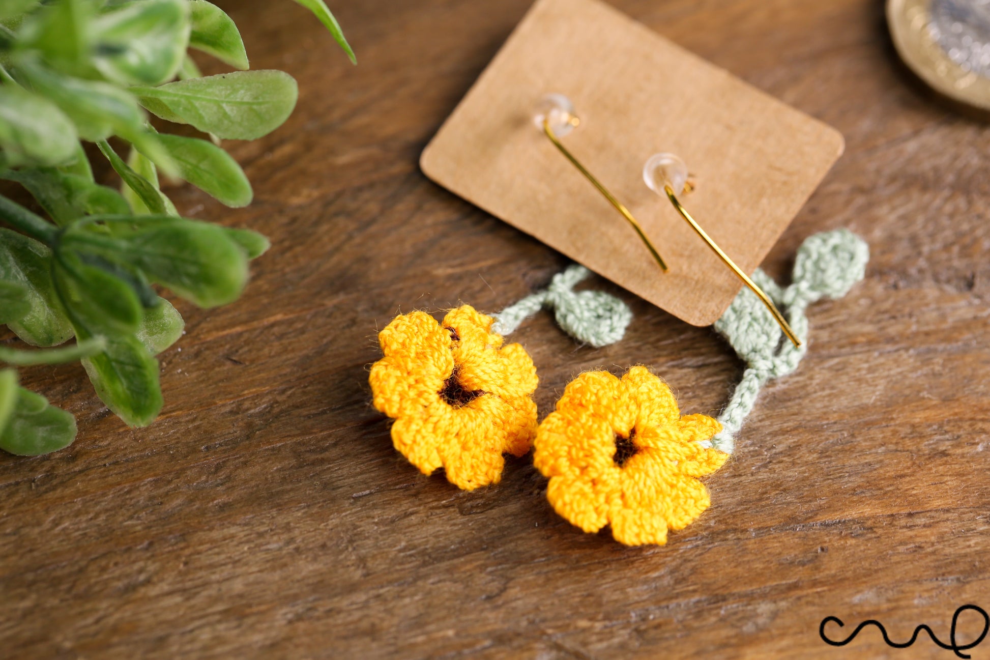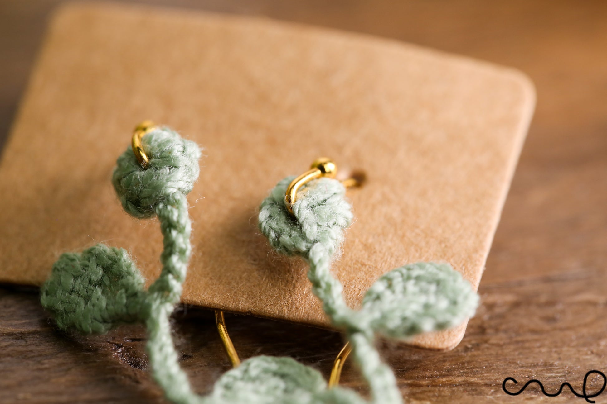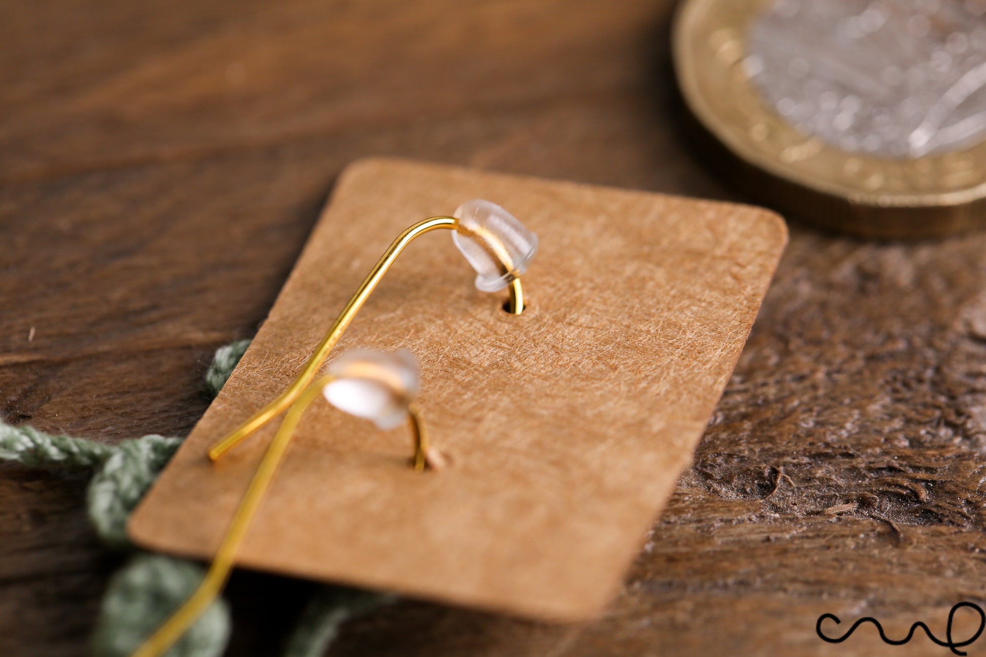 -Earrings are hung on a kraft paper holder