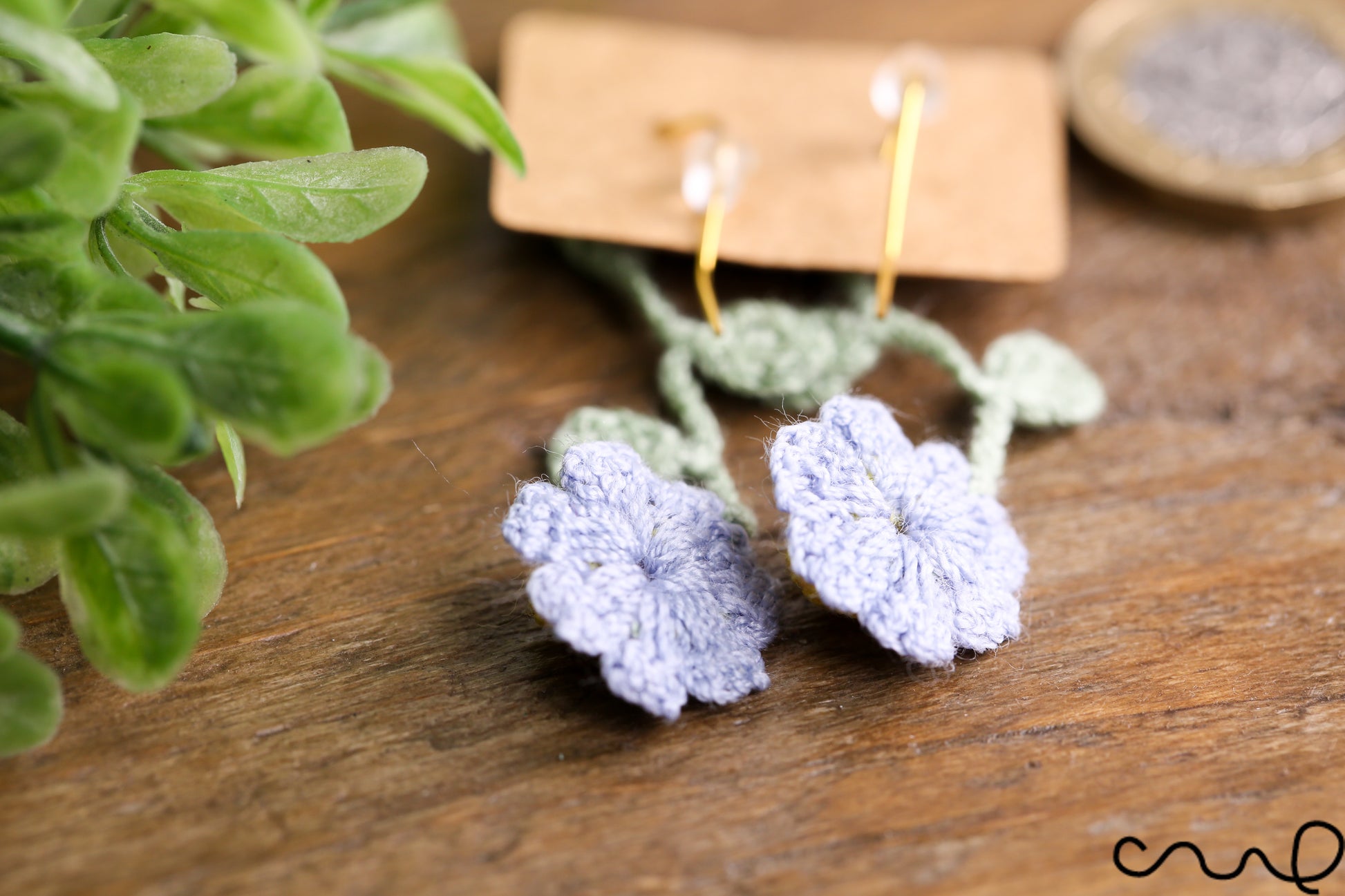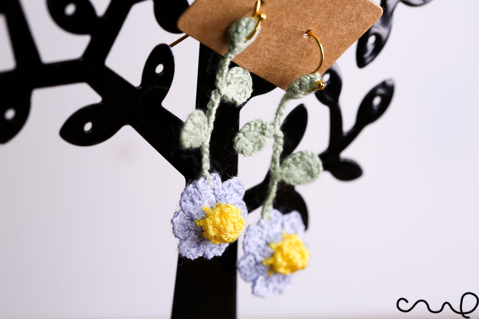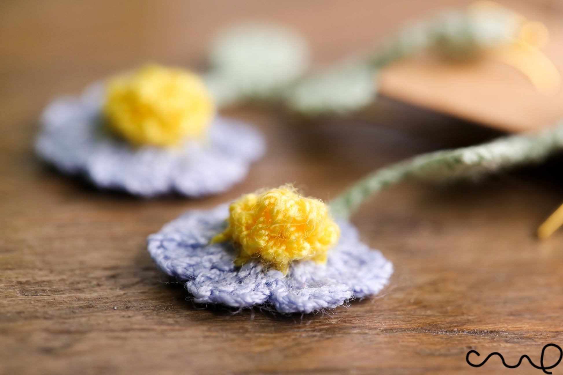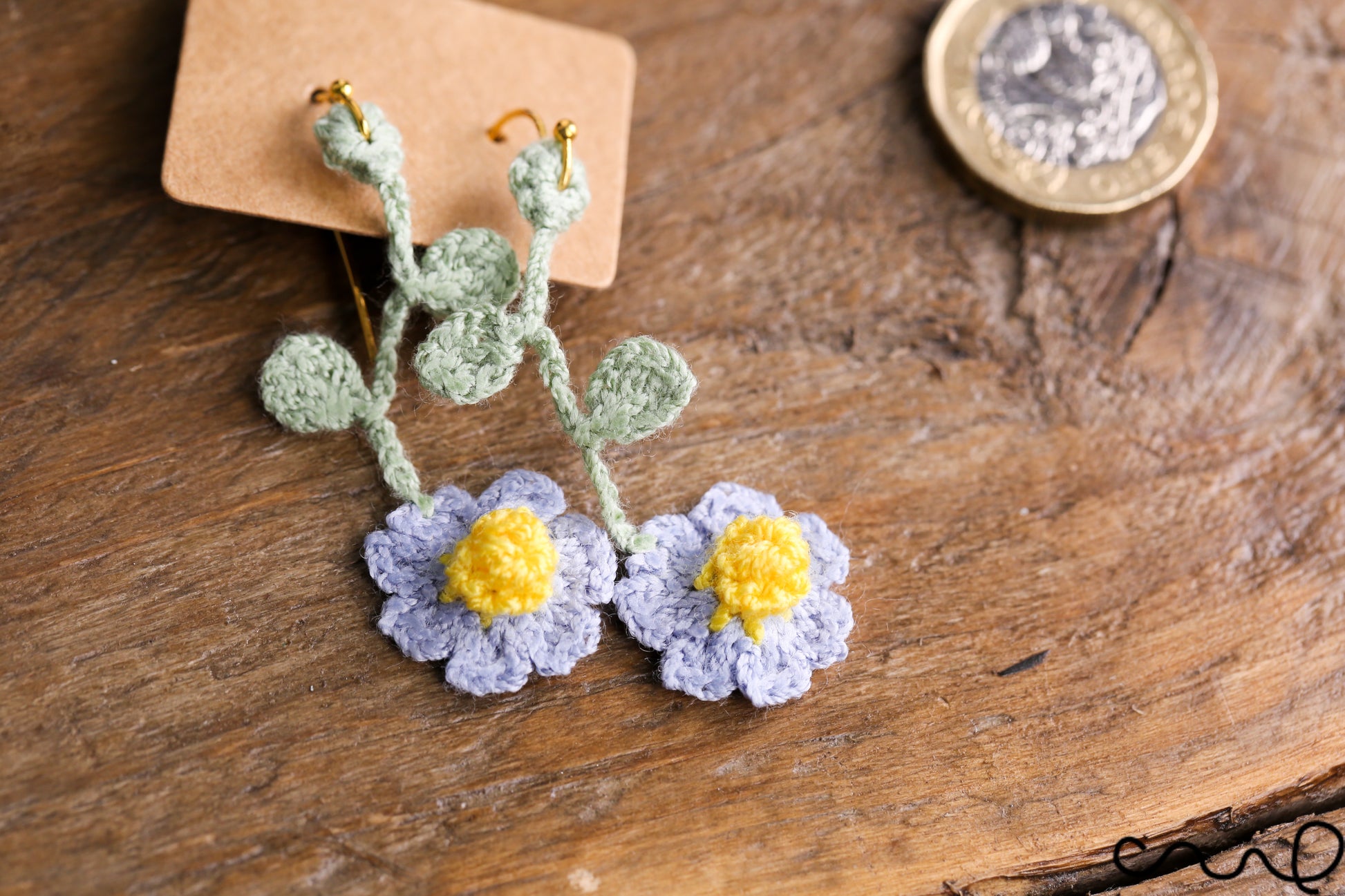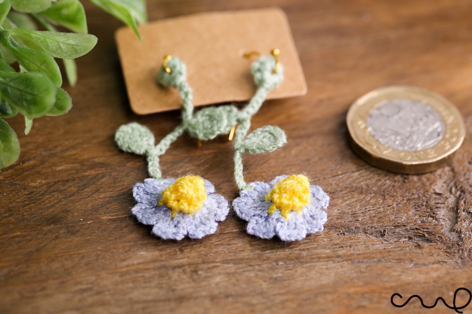 Handmade Earrings Hand Crocheted Dropping Flower Blue Colour Daisy Camomile