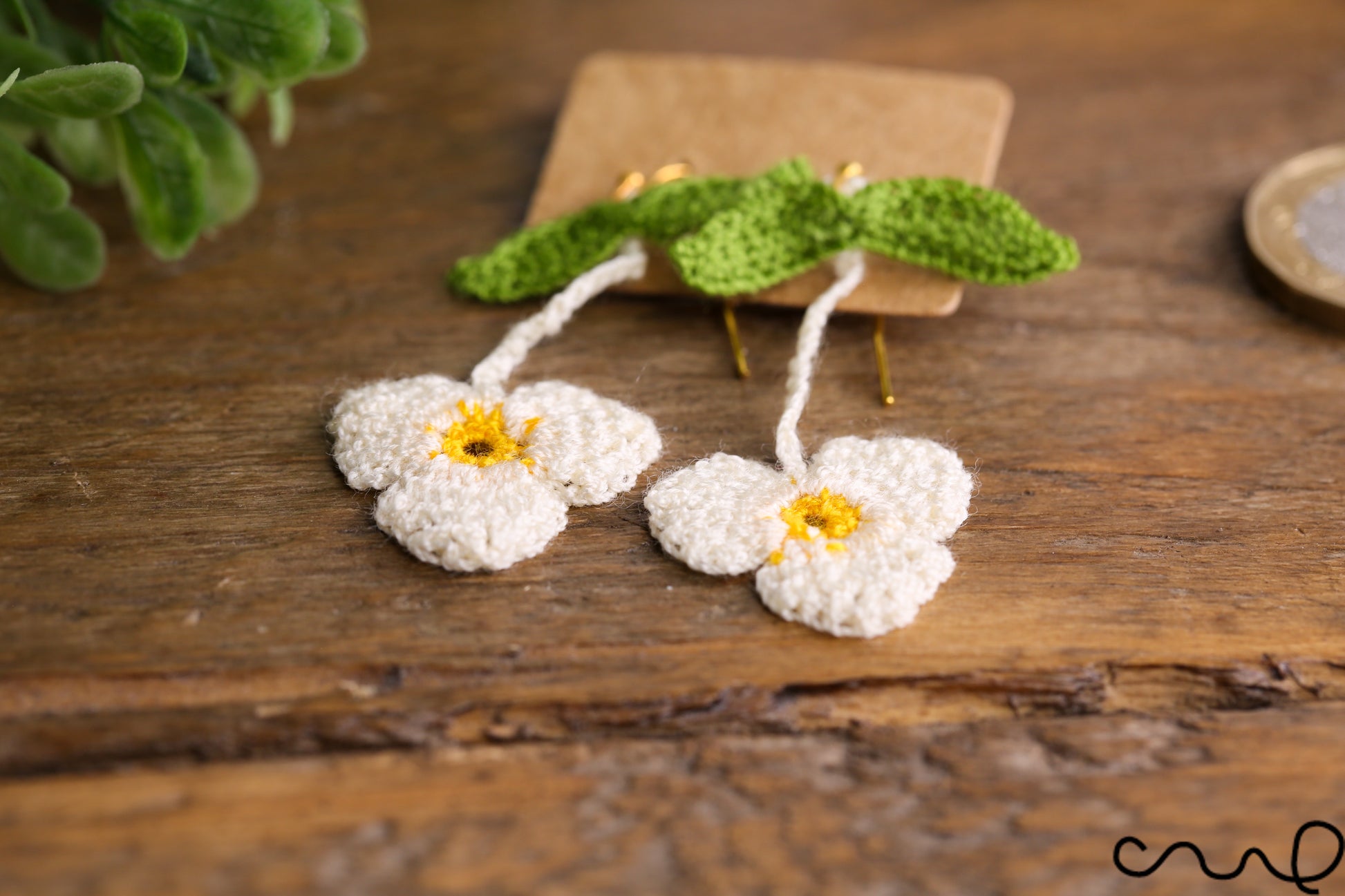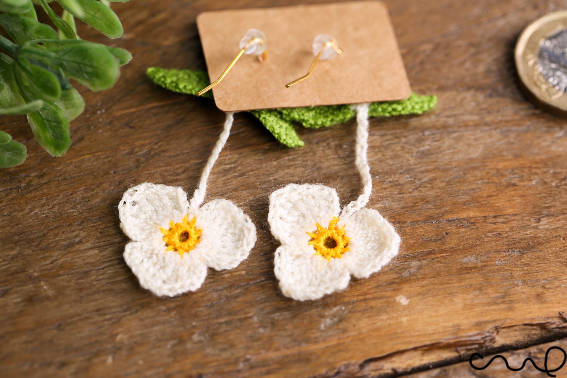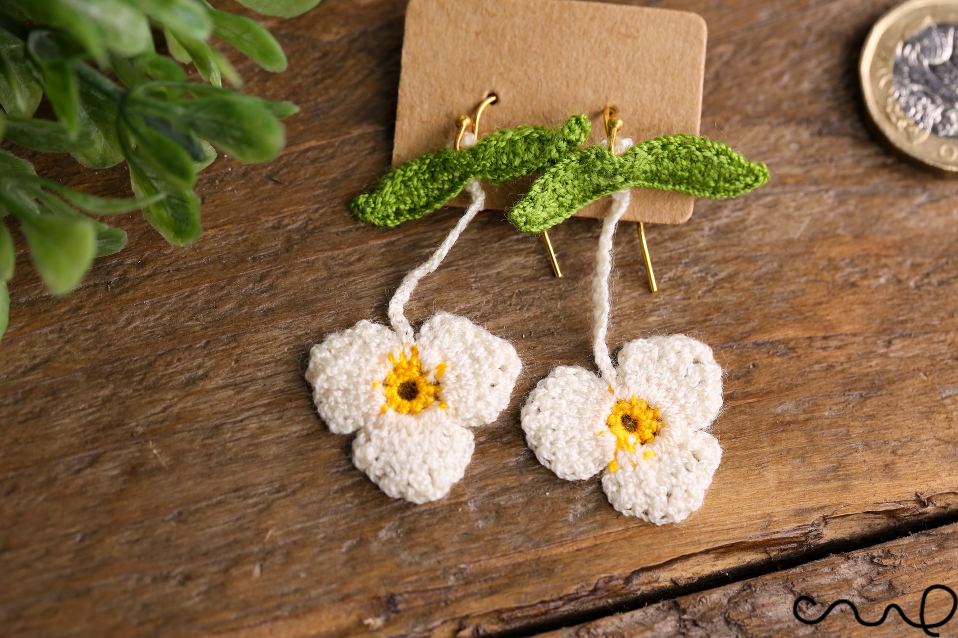 Handmade Earrings Hand Crocheted Dropping Flower White Colour Clover Shape