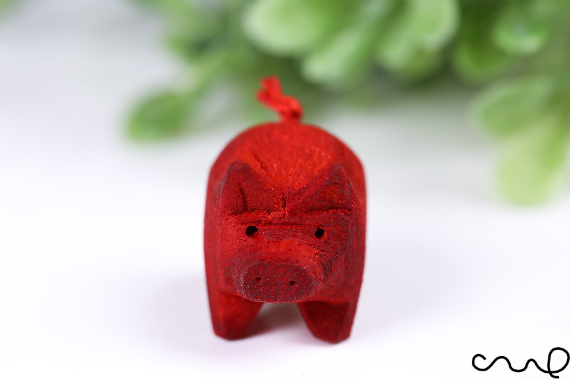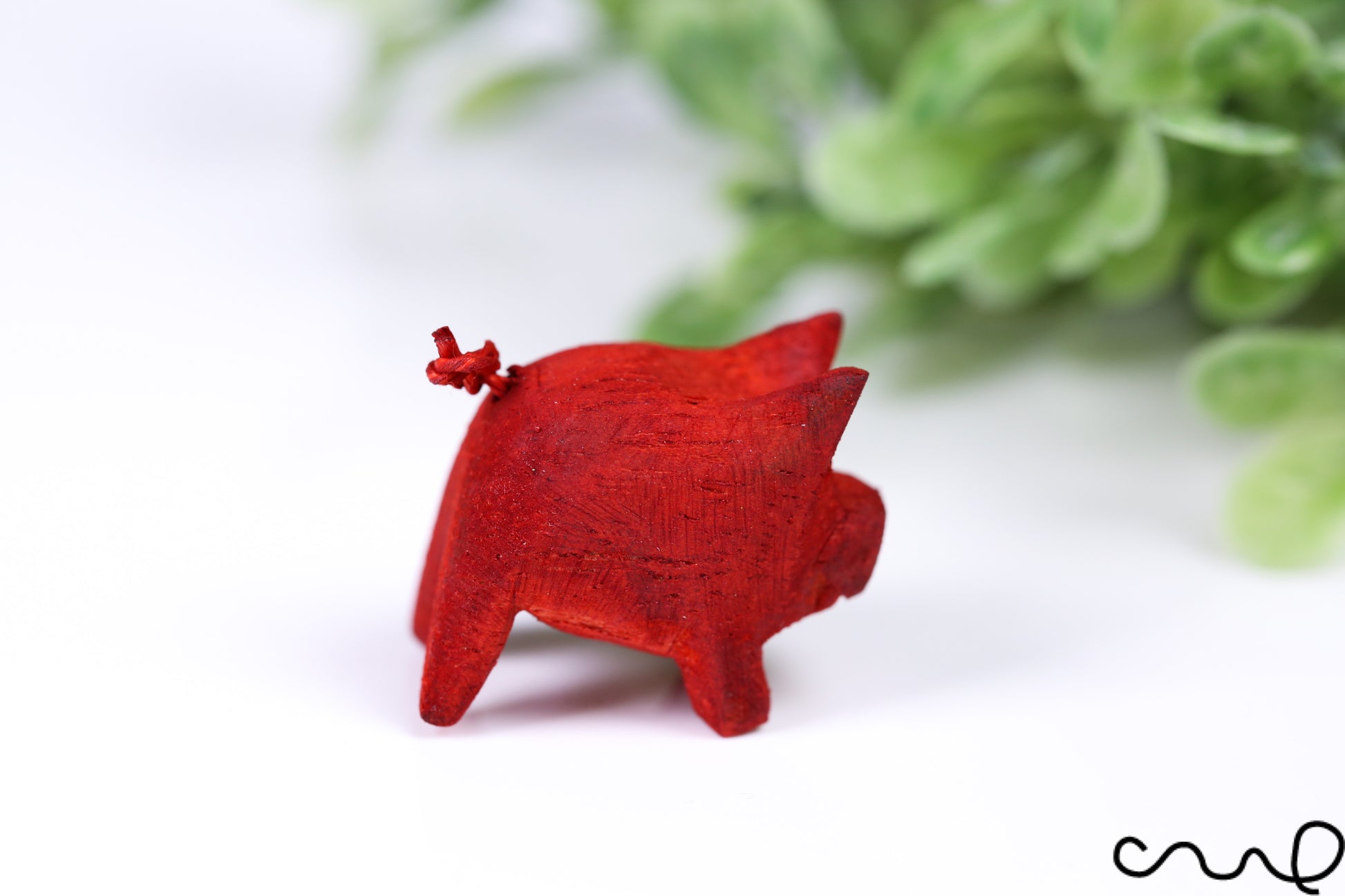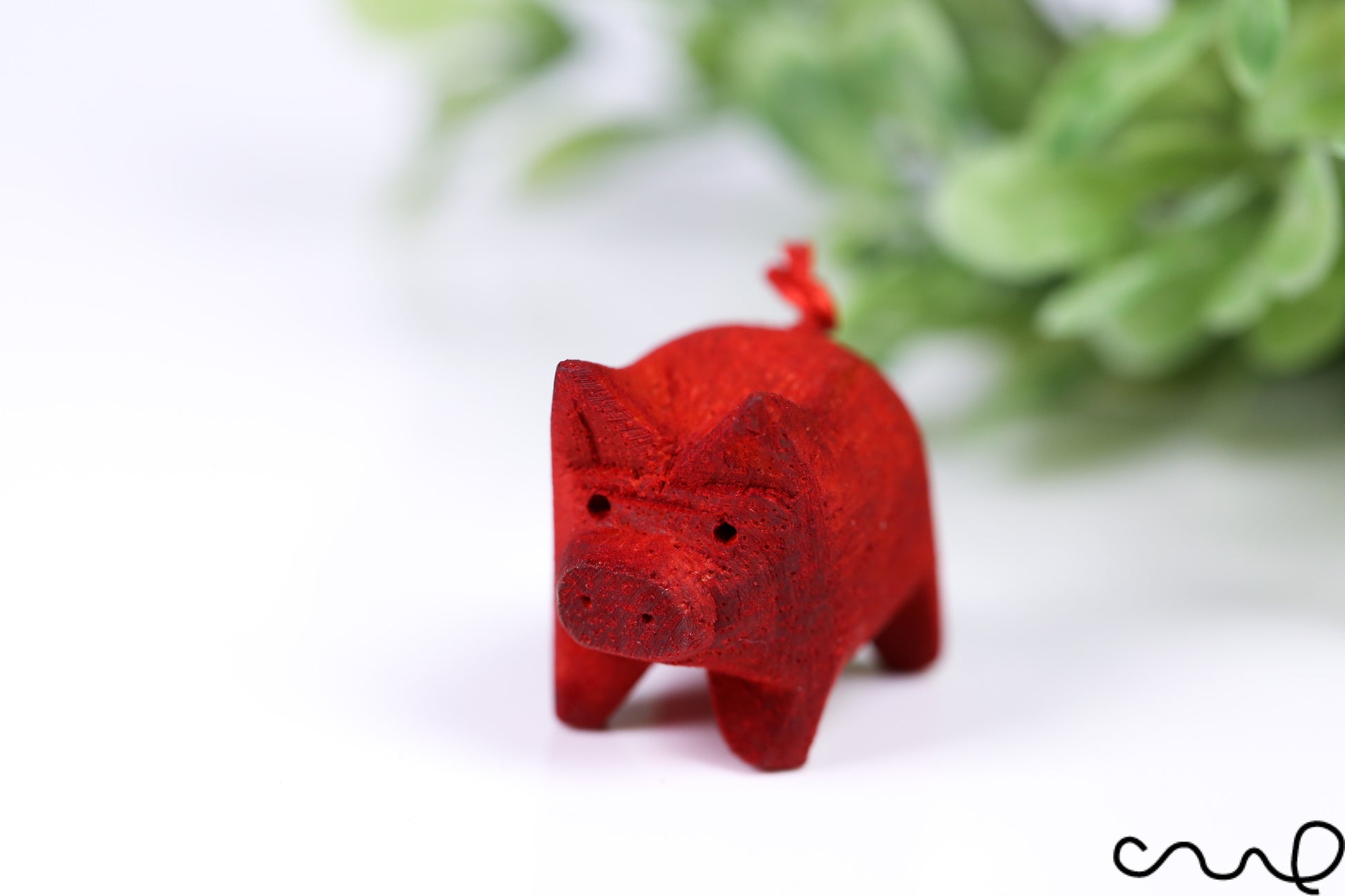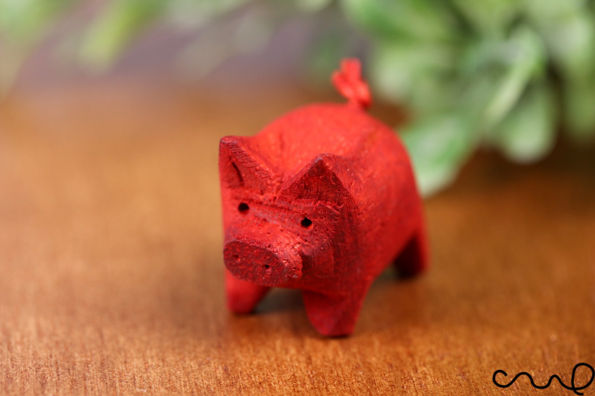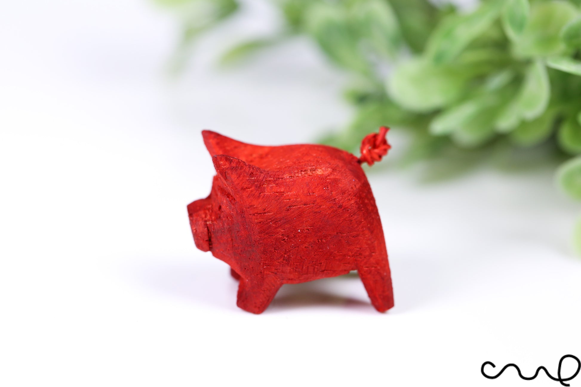 Hand-Carved Red Wooden Pig – Miniature Figurine with Curly Tail